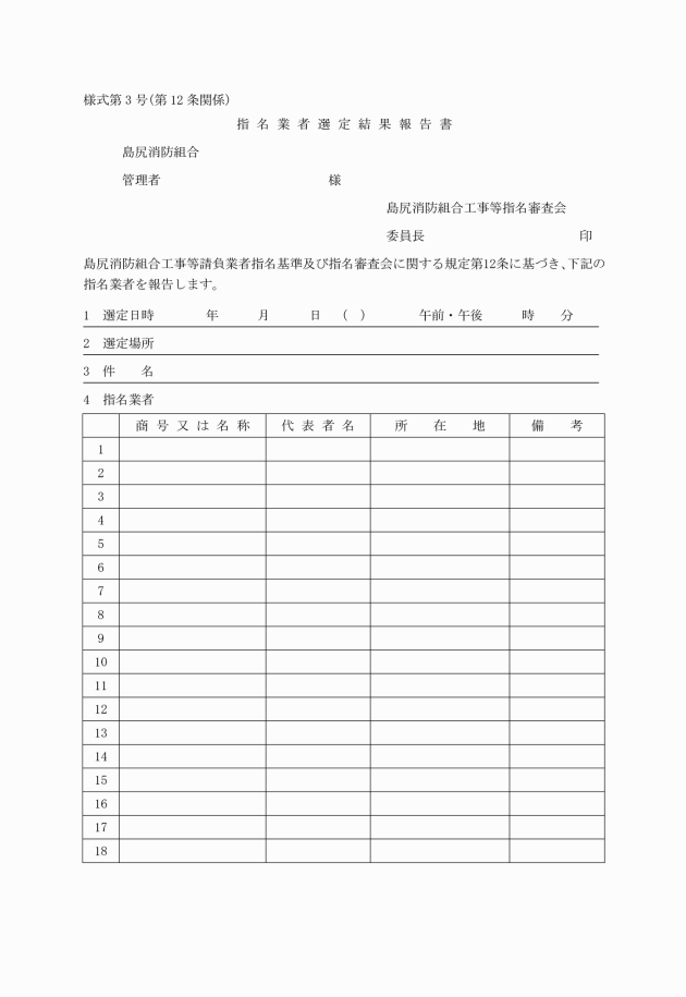 第12条 委員長は、審議決定した事項を遅滞なく、指名業者選定結果報告書(様式第3号)により管理者に報告しなければならない。